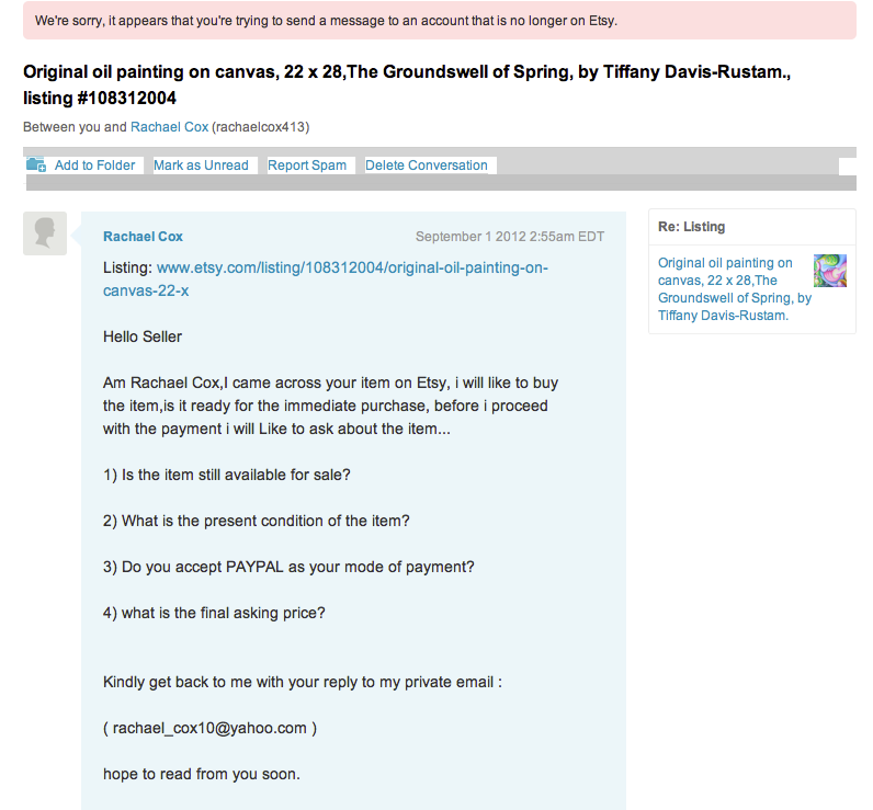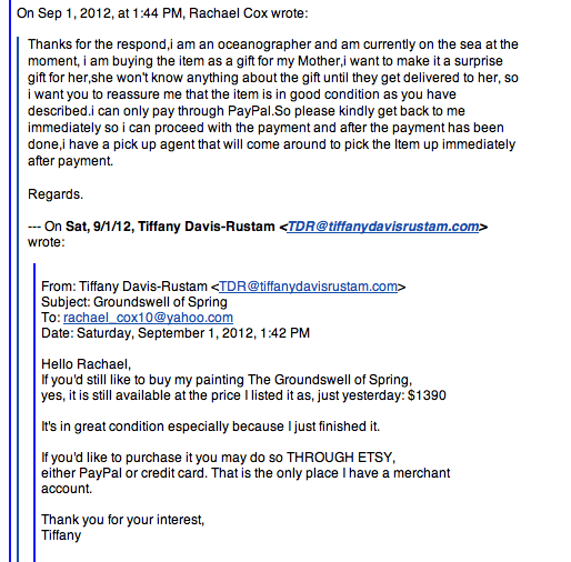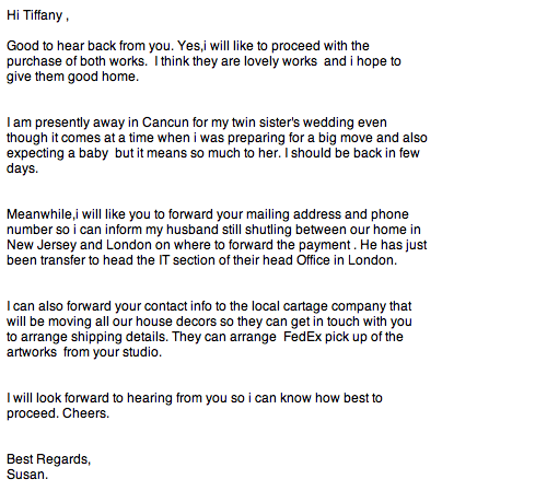 It makes me so sad that there are people out there trying to take advantage of us artists, as many of us work so ernestly to follow our creative passions and promote them too, often burning the midnight oil to follow our dreams, and just wishing for a sale here and there. I’ve researched this extensively, and all accounts lead us to believe that the creeps come from another country. Many point to Nigeria, where there are con-artist classes that many take, to learn how to cheat westerners out of money and goods. I’m not claiming this as fact, it’s just what I’ve read, and also heard from someone who visited Nigeria. In any case, desperate times lead to desperate measures.