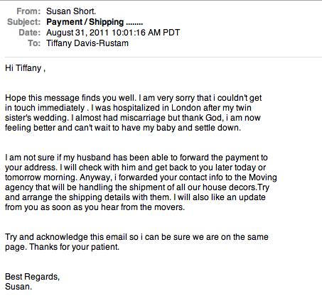 “meant i reely bad.” You may try to be forgiving at first, but this is usually worse than anyone who’s ever emailed you before. There are many typos, terrible phrasing, missing punctuation, trunicated or run-on sentences, no paragraph returns. Often they address you as “Seller” and not by your first name, and usually don’t even sign their name. Once someone signed their name with a period after it; that may seem like a small thing, but I’ve never seen anyone else do that, have you?