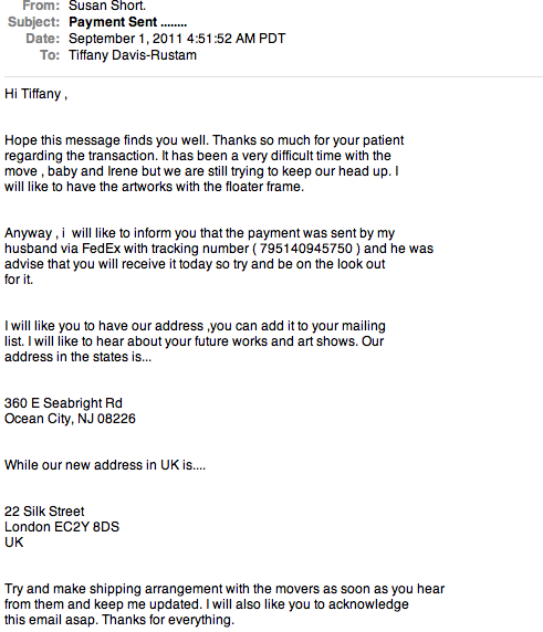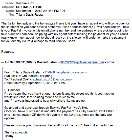 The first time it happened to me it came through my website, and I didn’t have any other purchase options available yet. I accepted credit card and PayPal, but they wanted to send a check, and then send a messenger to pick up the art. The check arrived a day later, Fed-Ex to my door, for TWICE the amount as requested, and they tried to arrange a pickup immediately that day. But I took it to the bank straight away before doing anything else, and it wouldn’t clear, due to insufficient funds. When I emailed them about it, no response whatsoever. Con. I was mad, but at least relieved that I hadn’t arranged for a pick-up and lost my art to criminals.