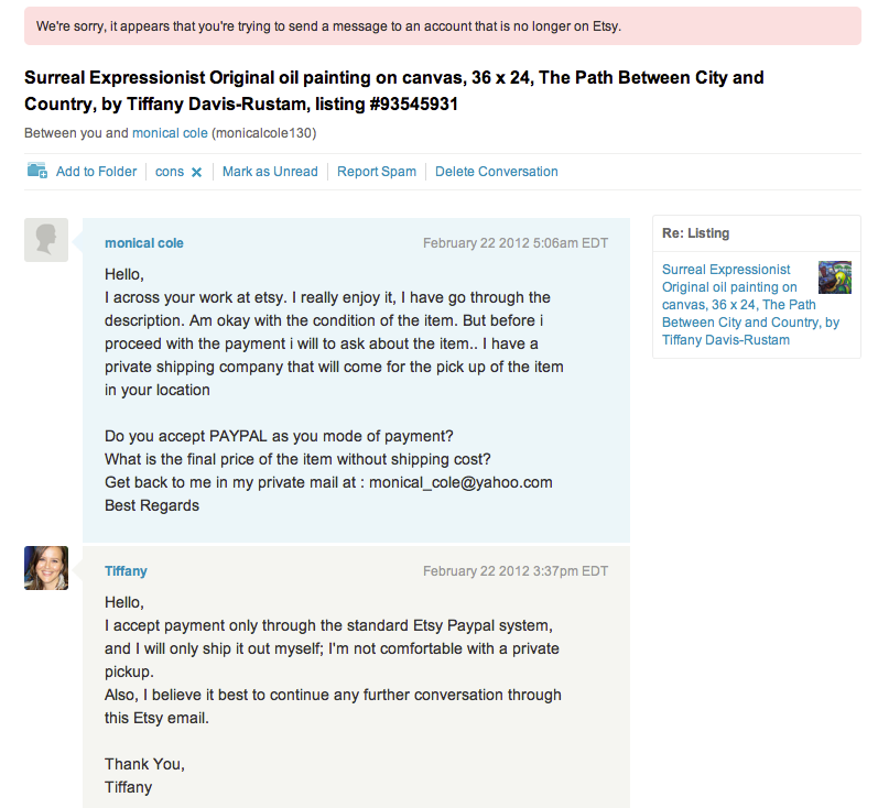 The next two times I’d set up an online shop on Etsy by then, I was approached through my Etsy account, by deactivated user accounts no less, who insisted on taking the convo off Etsy immediately, and arranging alternative means of payment. Etsy is so super simple even my tech-challenged parents could figure it out, and it’s very secure purchasing.